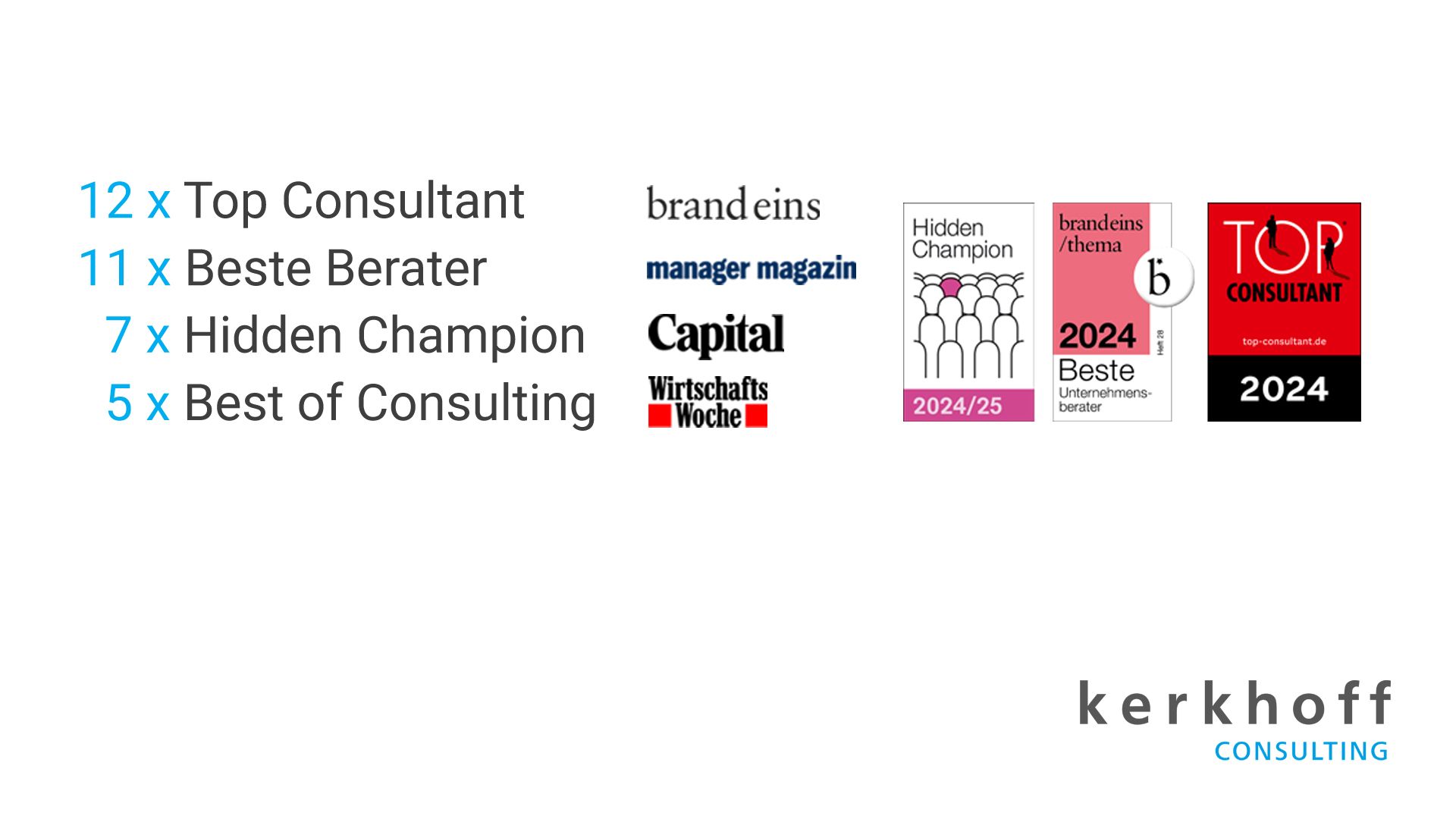 Kerkhoff Consulting was named one of the best management consultants 2024 for purchasing & procurement by the Handelsblatt Research Institute (HRI). The HRI first identified a peer group of 15,700 management consultants from over 335 companies. The participants were then asked about the most renowned companies in their respective consulting areas. Due to its excellent ranking, Kerkhoff Consulting, which works across industries, was listed for purchasing & procurement as well as consumer goods & retail.
