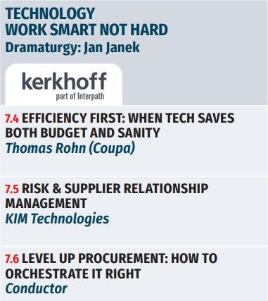 Besuchen Sie unsere Bühne, um Strategien für die Kostensenkung sowie moderne Tools und Techniken zu erleben. Lernen sie die Vorteile kennen, die beispielsweise Conductor, Coupa, KIM und ADR realisieren lassen. Wir freuen uns darauf insbesondere auch österreichische und deutsche Unternehmen zu begrüßen und gemeinsam die Zukunft des Einkaufs zu gestalten!